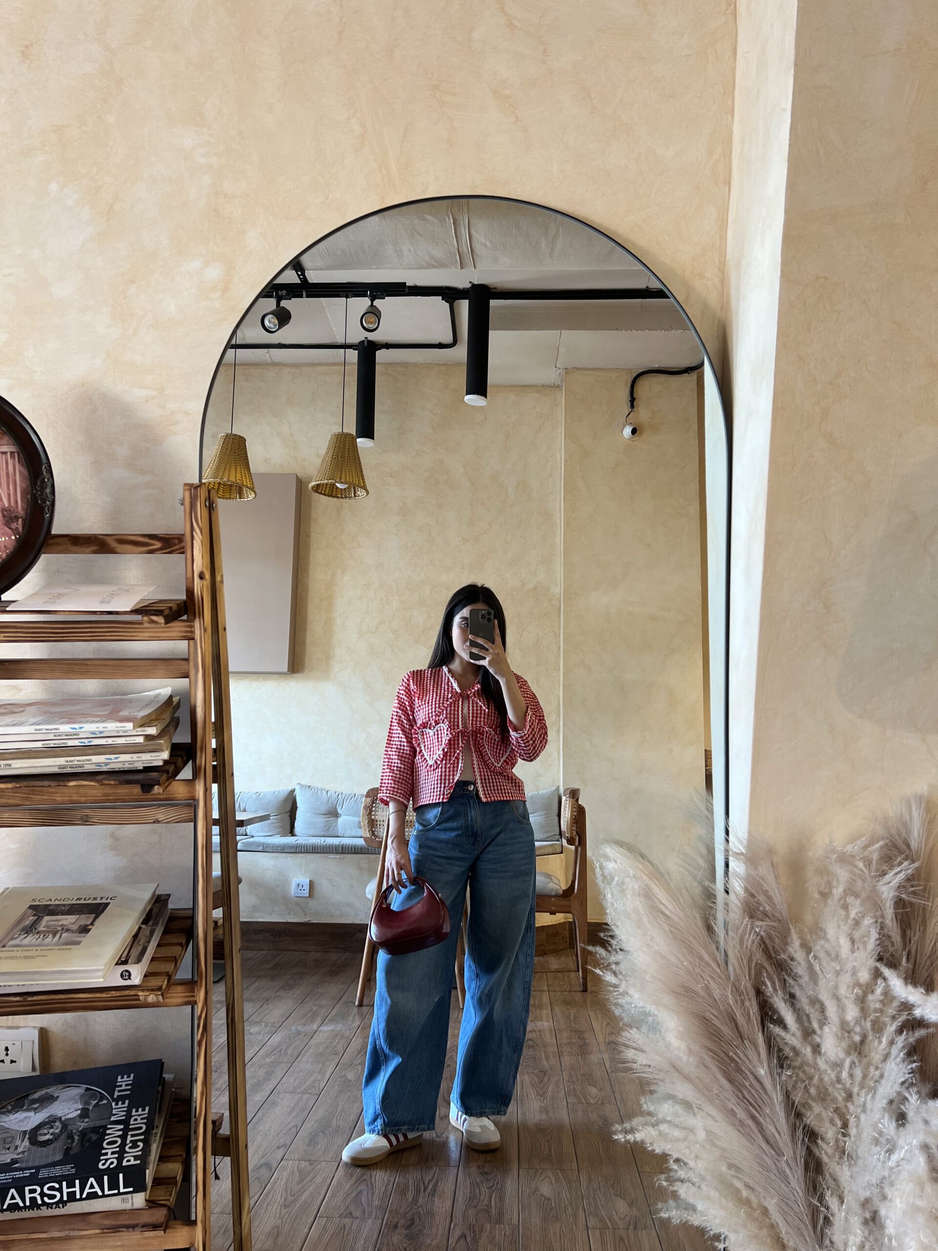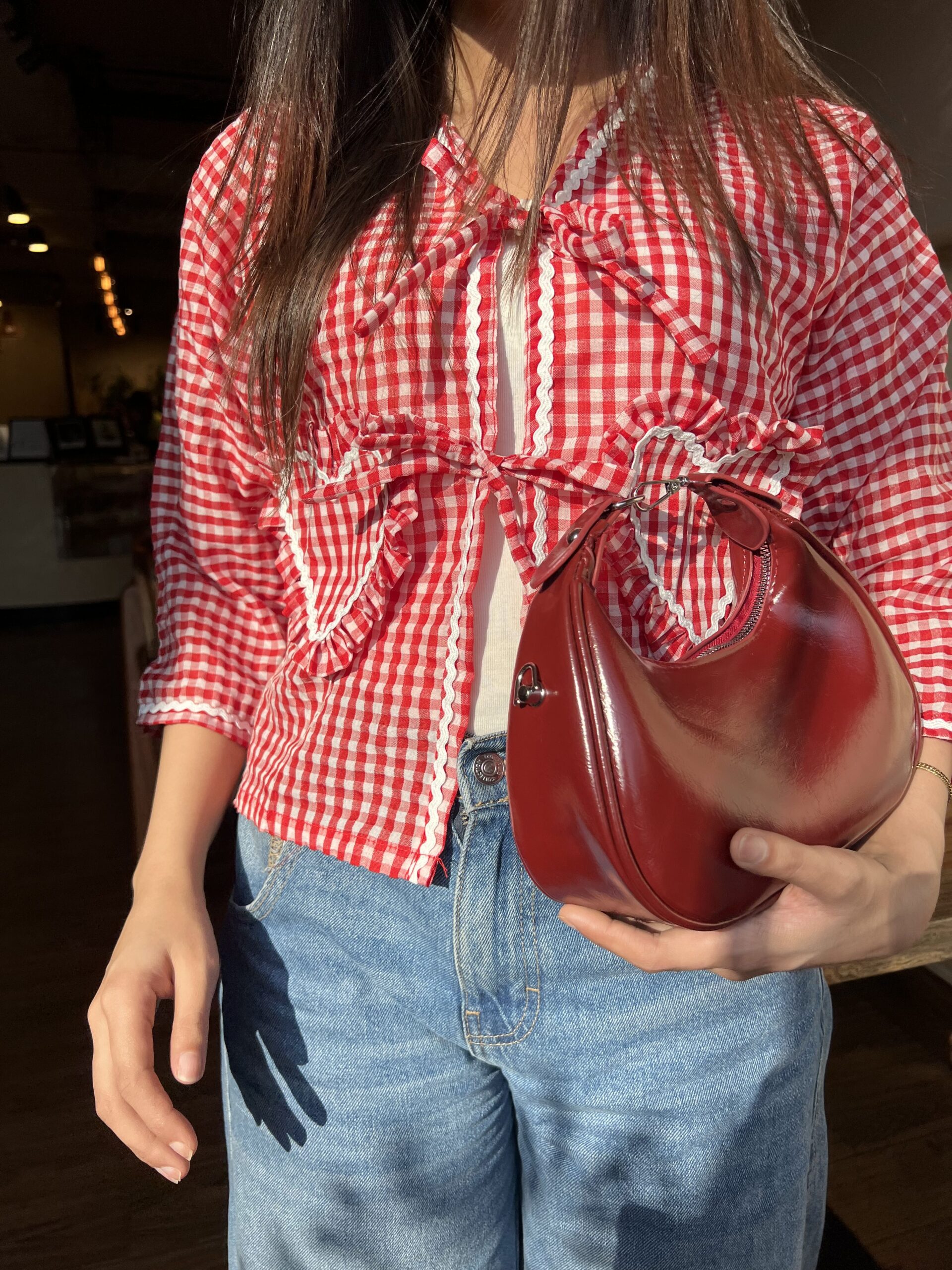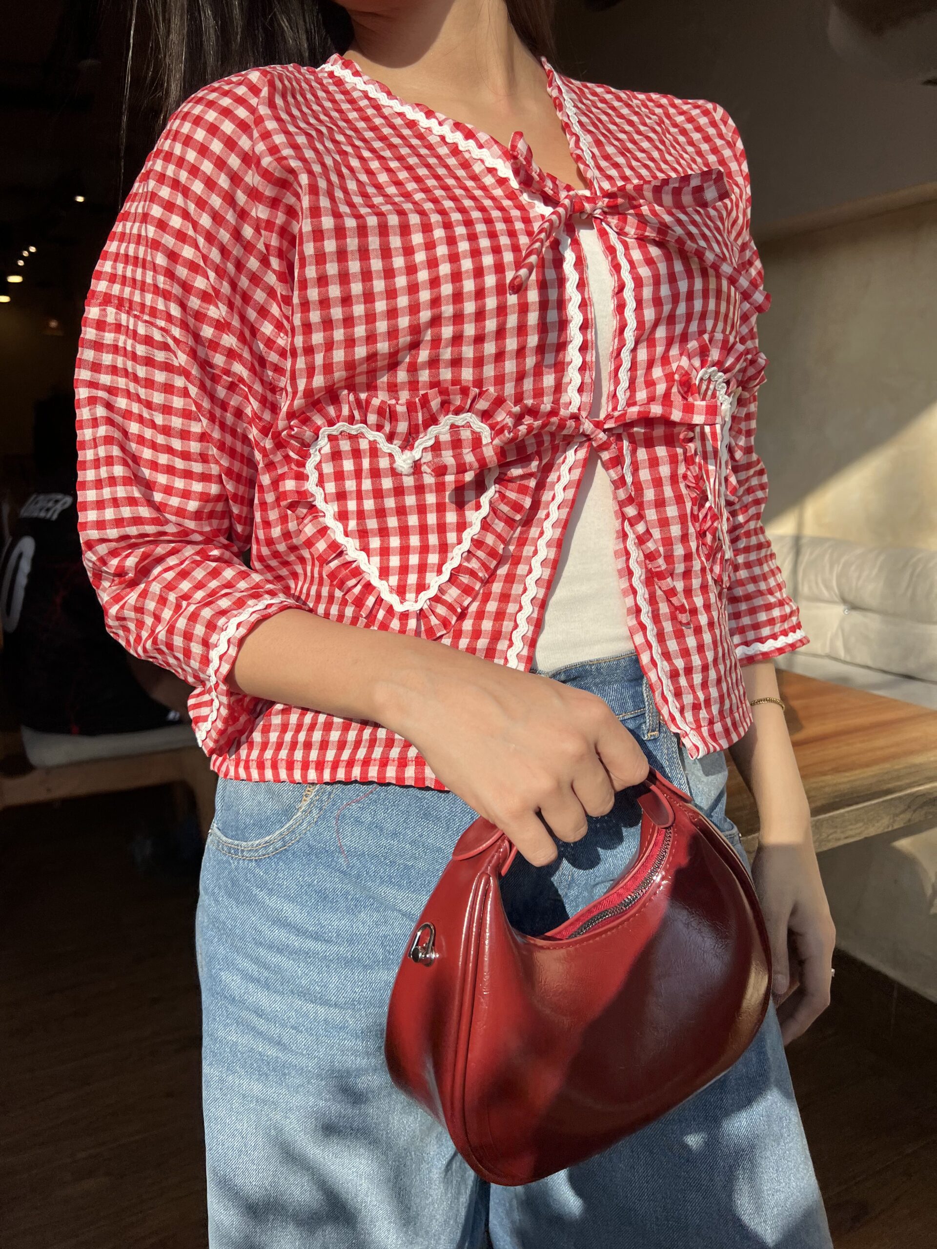 Sweet as a summer picnic, this cute top pairs playful nostalgia with modern charm. The lightweight red-and-white check is trimmed in flirty ric-rac and finished with two heart-shaped front pockets framed by ruffled edges. Self-tie bows run down the open front, letting you style it loose over a tank or cinched for a figure-skimming silhouette.