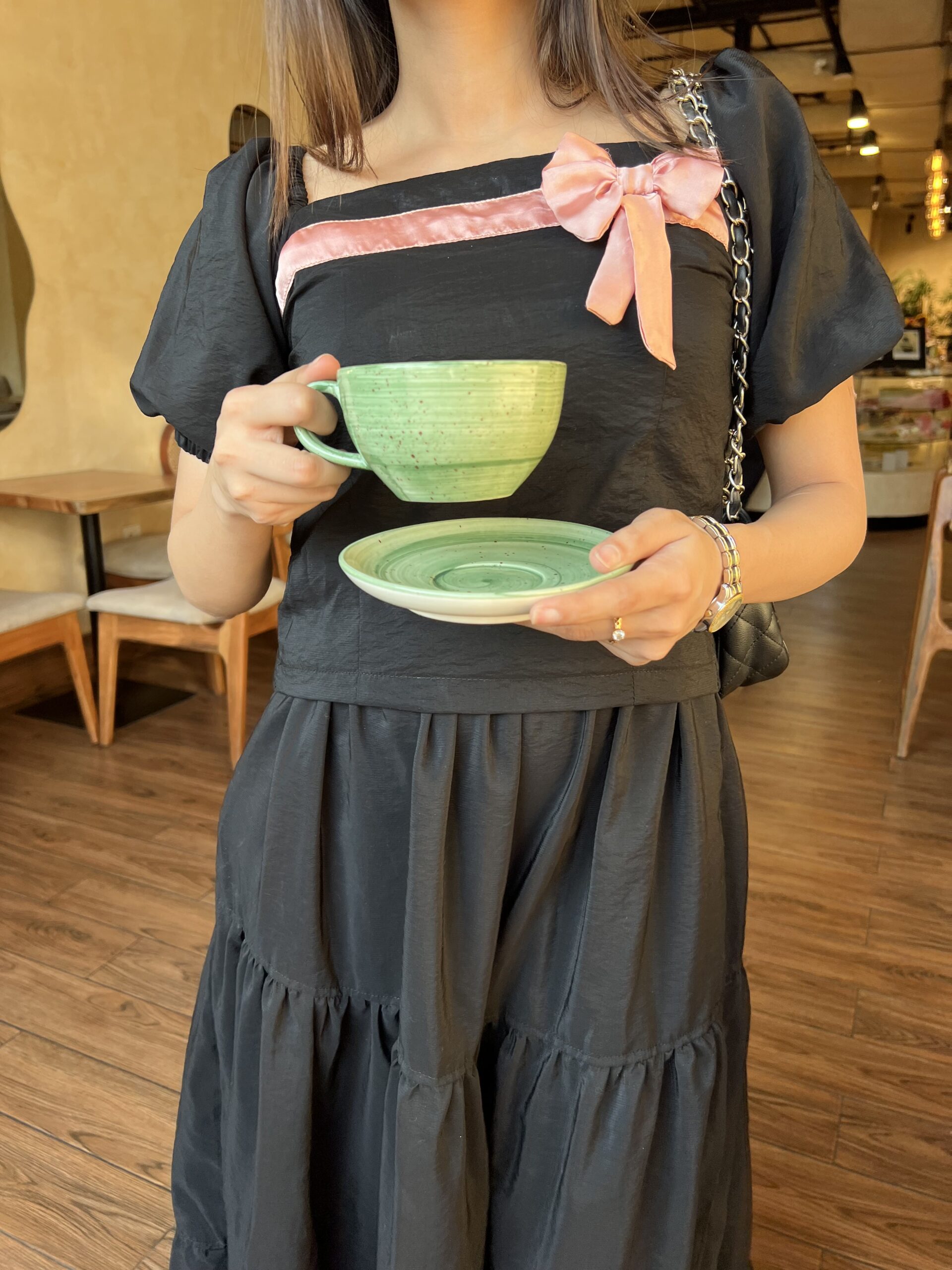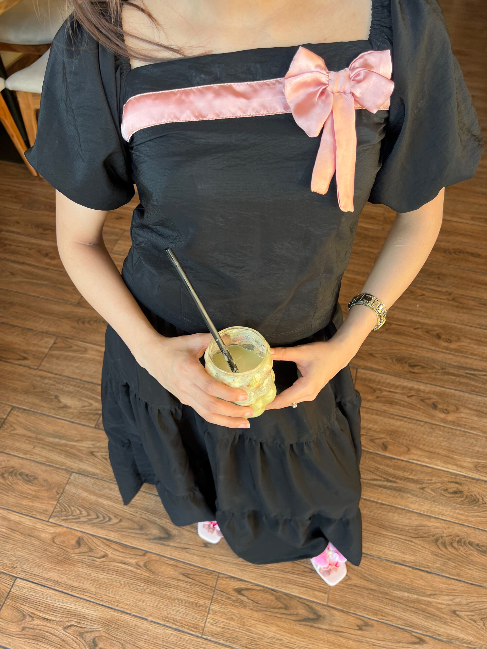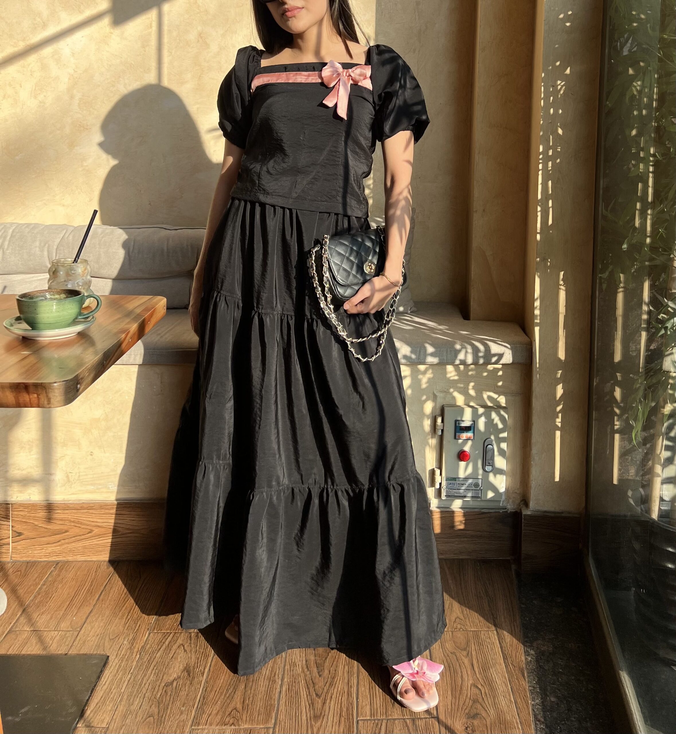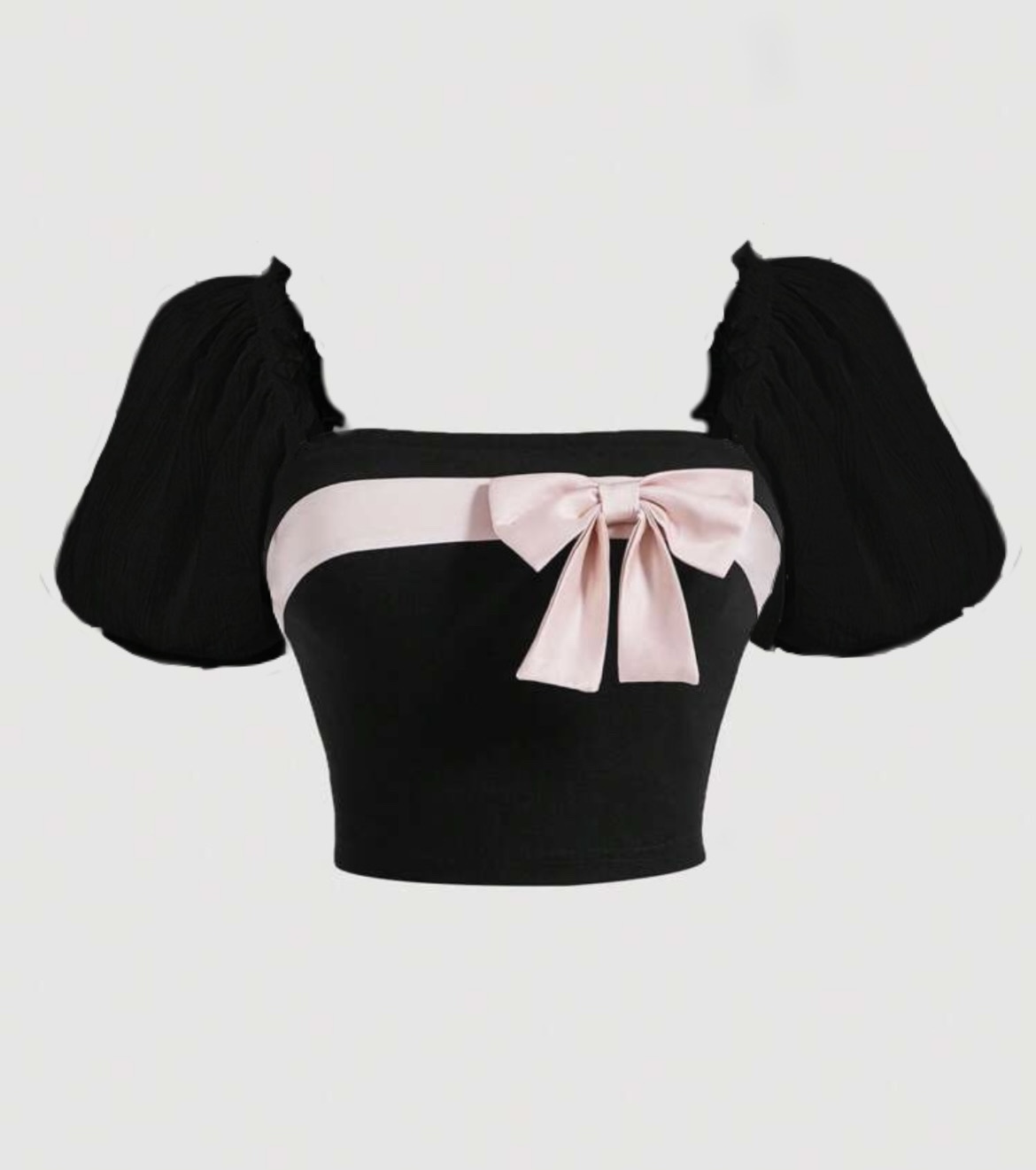 Channel your inner coquette with this cropped black sweetheart top—its voluminous puff sleeves and blush-pink satin bow make an irresistible statement. Pair it with a flowing black maxi skirt for a sleek, elongating silhouette that lets the delicate ribbon detail truly shine.